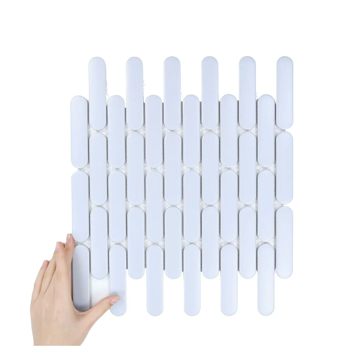 Oblé dlaždice ve tvaru piškotů umístěné na síťkách vytvářejí jemný a zároveň výrazný rytmus, který interiéru dodává lehkost a originalitu.