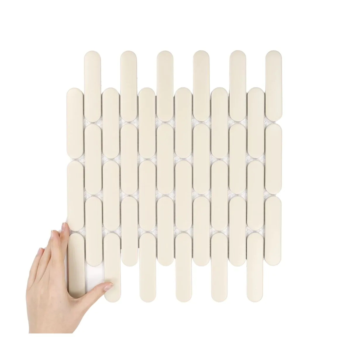 Oblé dlaždice ve tvaru piškotů umístěné na síťkách vytvářejí jemný a zároveň výrazný rytmus, který interiéru dodává lehkost a originalitu.