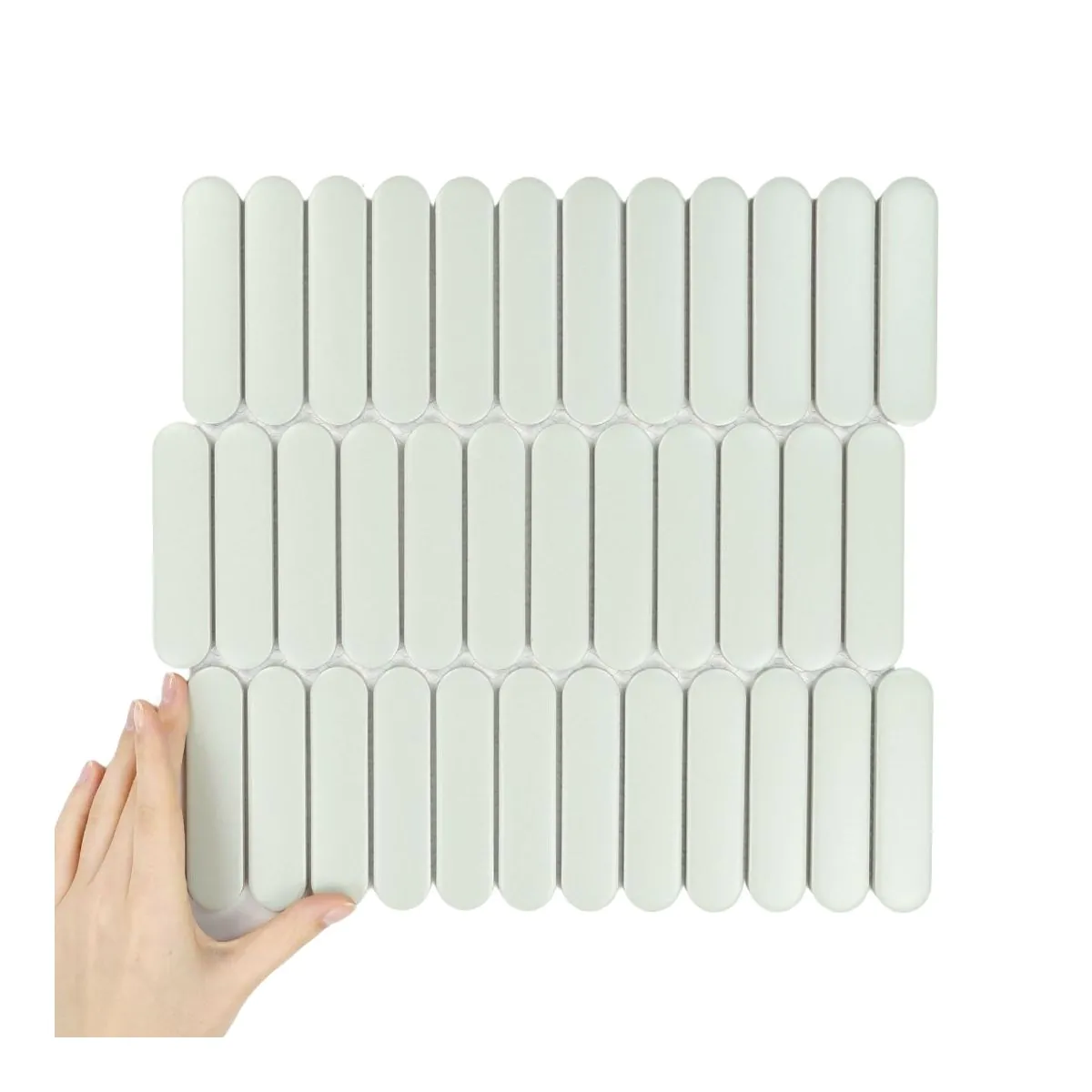 Oblé dlaždice ve tvaru piškotů umístěné na síťkách vytvářejí jemný a zároveň výrazný rytmus, který interiéru dodává lehkost a originalitu.