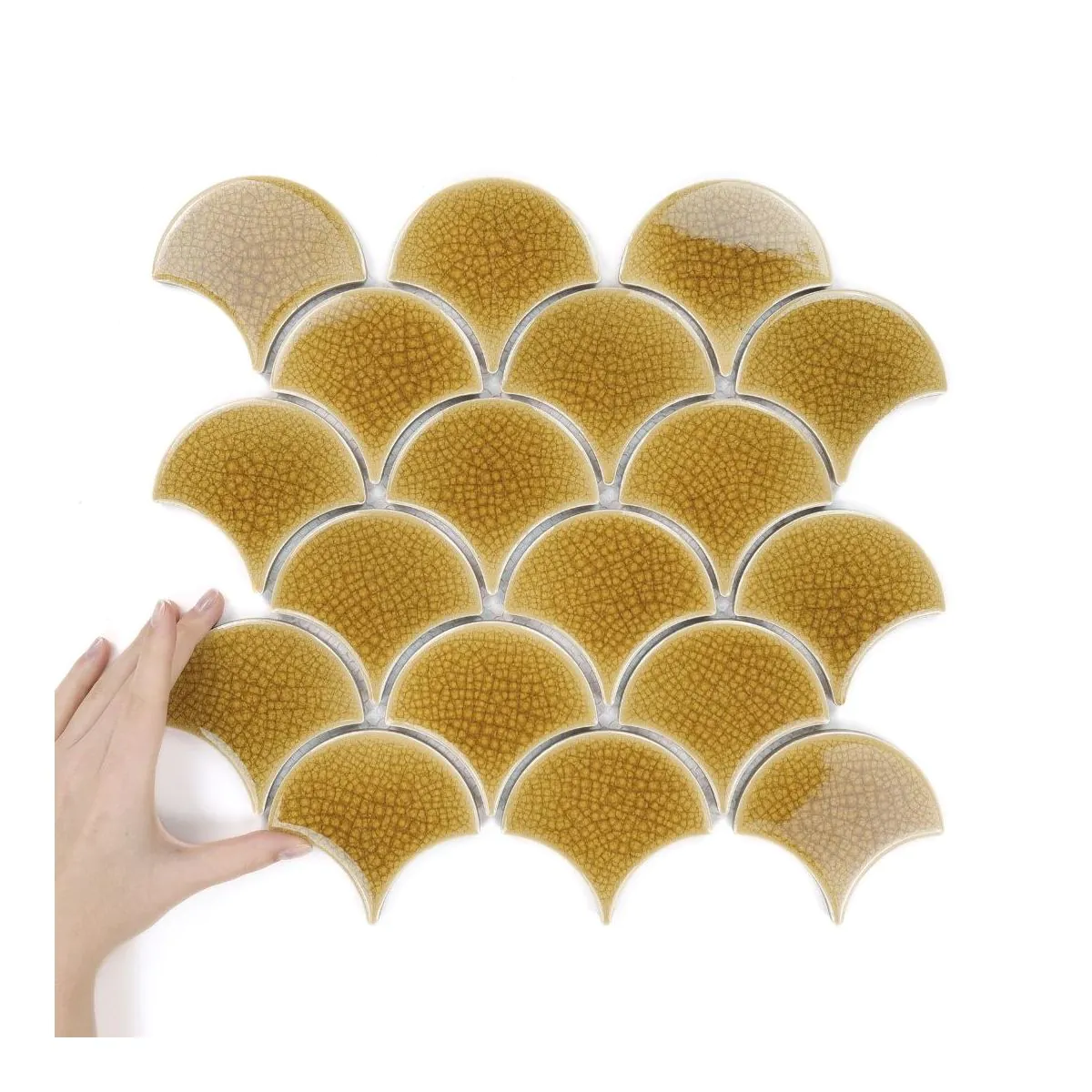 Dlaždice ve tvaru rybích šupin umístěné na síťkách vytvářejí efekt vlnící se plochy, která do interiéru vnáší lehkost a jemný pohyb.