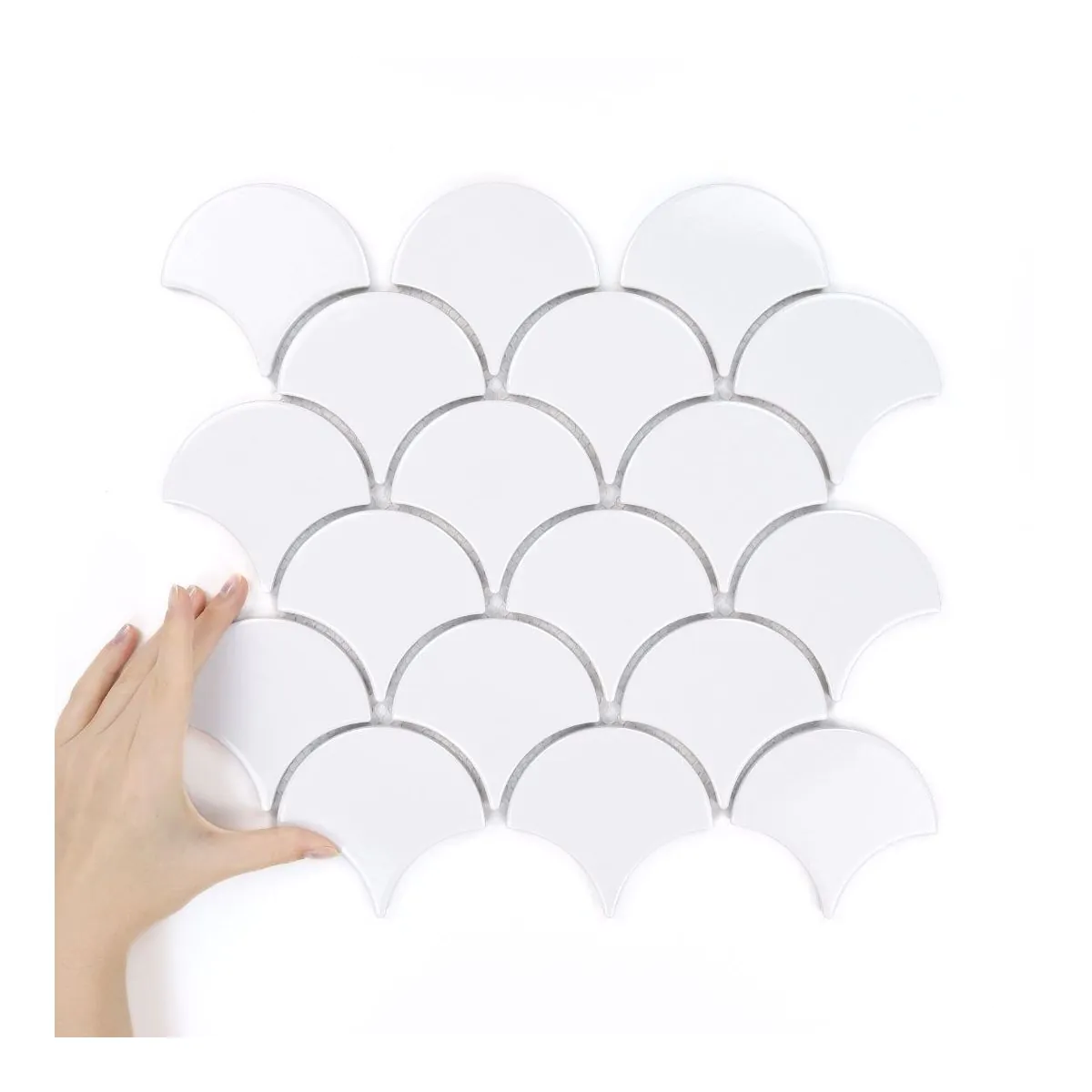 Dlaždice ve tvaru rybích šupin umístěné na síťkách vytvářejí efekt vlnící se plochy, která do interiéru vnáší lehkost a jemný pohyb.